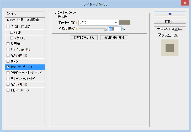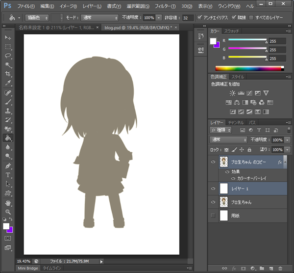 複製したレイヤーに対して「レイヤー効果」の「カラーオーバーレイ」でまず灰色にする。「キャラを単色で塗りつぶし表示する–カラーオーバーレイの使用」参照。