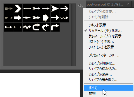 ツールウィンドウから「カスタムシェイプツール」を選択。