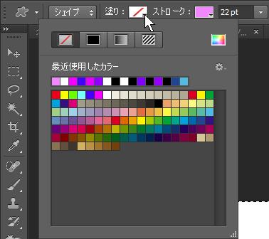 ツールバーのシェイプの塗りつぶしの色や、線(ストローク)の色や太さや模様?(点線など)を選べる。「カスタムシェイプツール」を選択していないと表示されない。