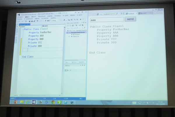 話した(実演した)内容は、Visual Studio でコーディングしている内容(ソースコード)を、リアルタイムに配信して Web ブラウザーで表示するというもの。