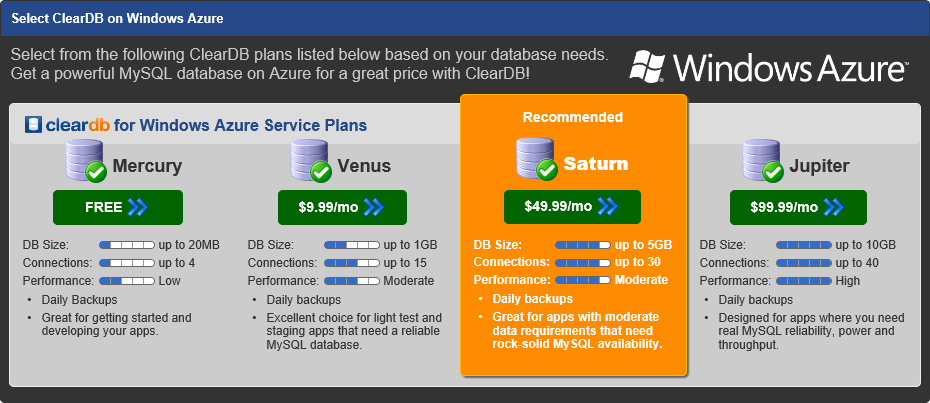 Azure Web Sites ユーザーは、ClearDB のサイトで MySQL のプランをアップグレードできます。ここで登録すると ClearDB のサイトで、Azure Web Sites の MySQL DB の状態を見たり、DB のバックアップやリストができます! アップグレードしなくても使えるので活用しちゃいましょう。