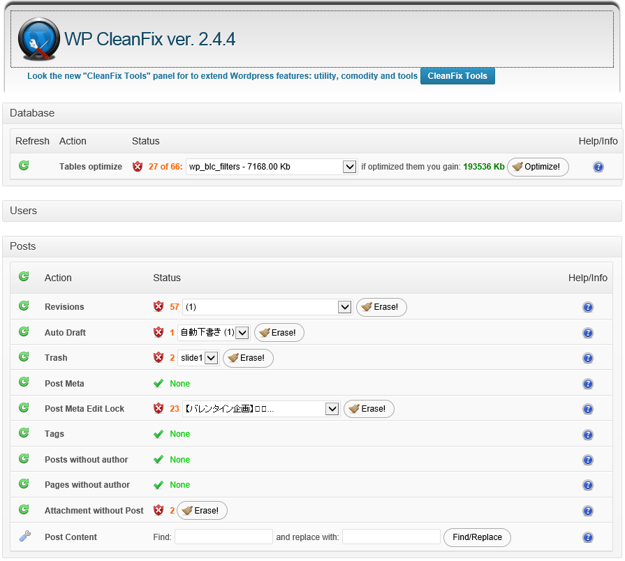 実際に試してみた DB サイズを減らすためのプラグインを紹介しておきます。WP CleanFix というプラグインで、DB サイズを減らせます。WordPress はリビジョン管理や、複数人で編集のための情報や、自動保存などいろいろとデータが増えるので、不要であれば消せるというもの。