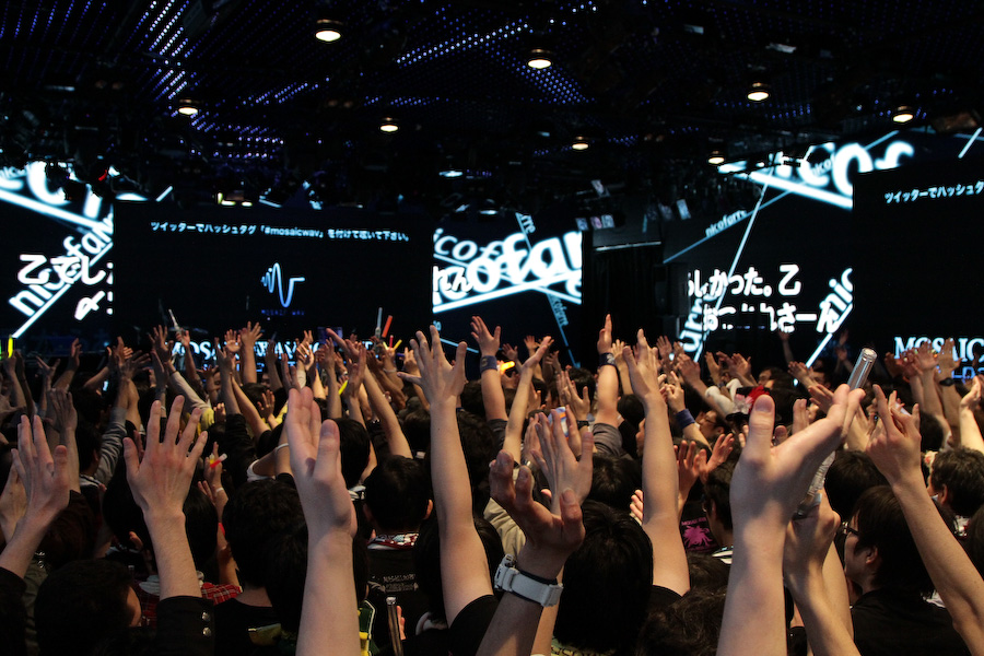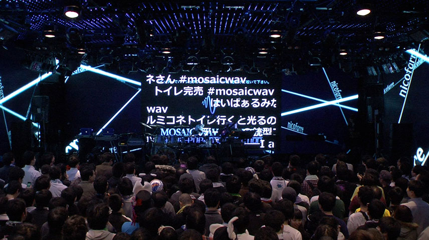 MOSAIC.WAV では以前から、待ち時間や・ライブ中にお客さんが手軽に参加できるようハッシュタグの付いているツイートをスクリーンに表示されているそうです。