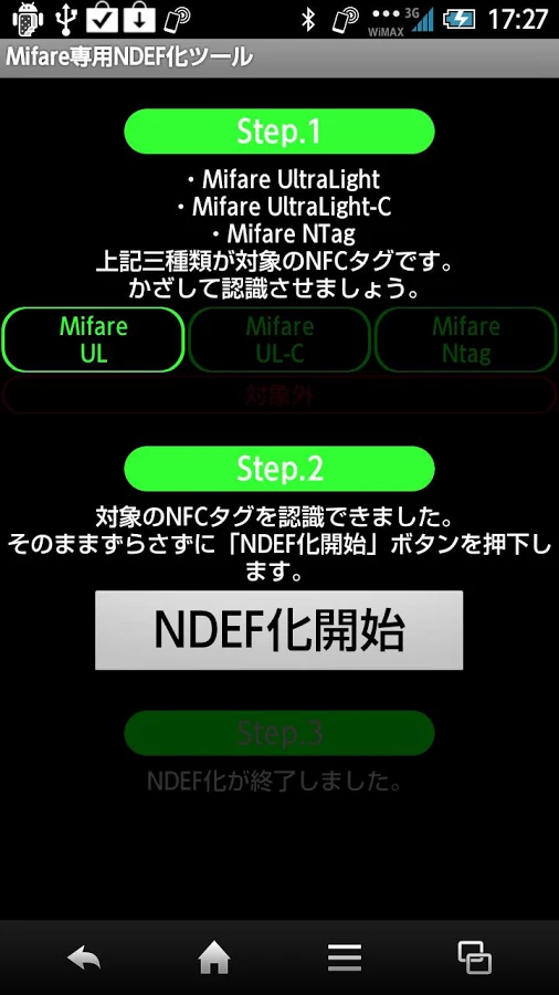 NFC をかざすだけで、Mifare のタイプを判断し、ボタンタップで初期化(NDEF というフォーマット化)してくれます。
