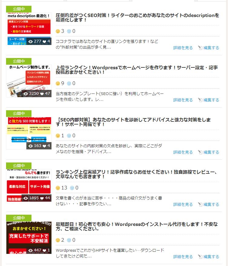 記事作成のサービスで実績を積んで、コツをつかんだ頃、更に得意を出品してサービスの幅を広げようという気になりました。私は記事作成のみならず WEB 制作も得意としていたので、その後 WEB 関連のサービスを4つ出品しました。写真は私の出品サービスの一覧です。