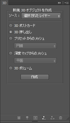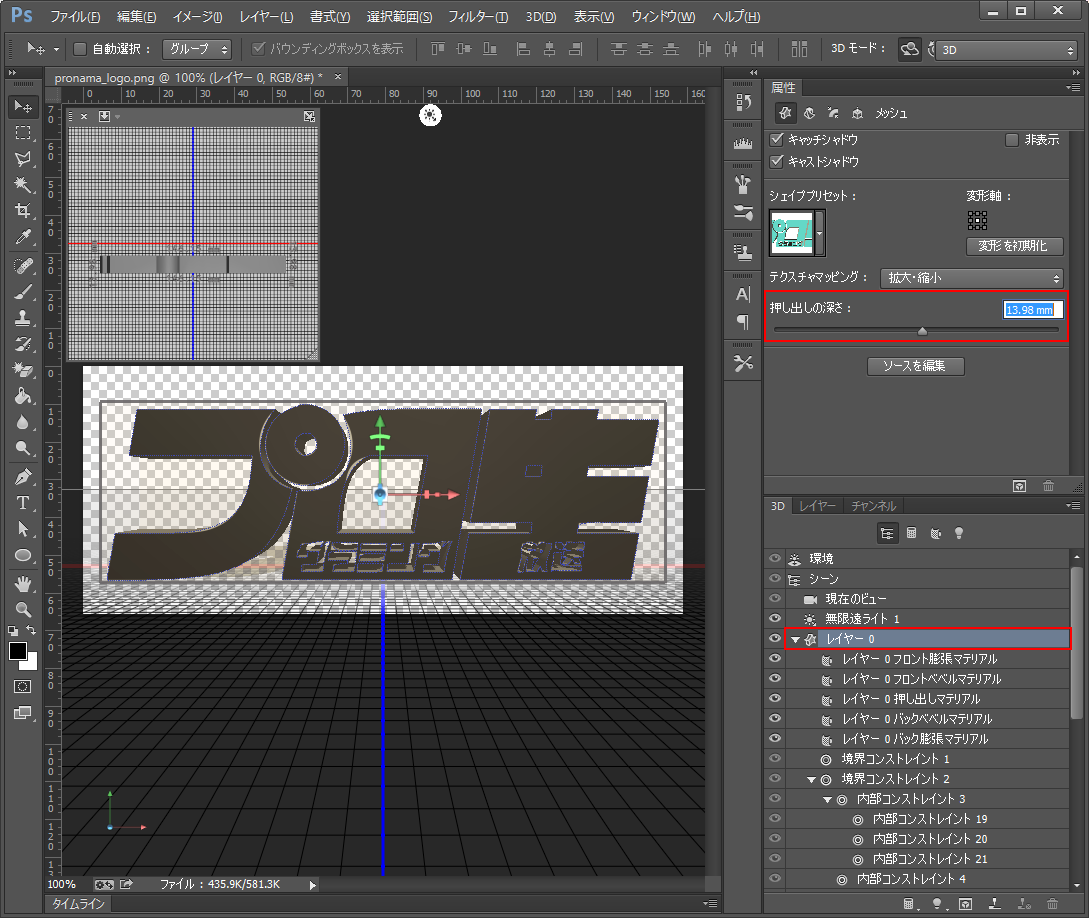 3D ウィンドウのレイヤーを選択すると、属性ウィンドウで押し出しの深さを変更できます(図の赤枠部分)。