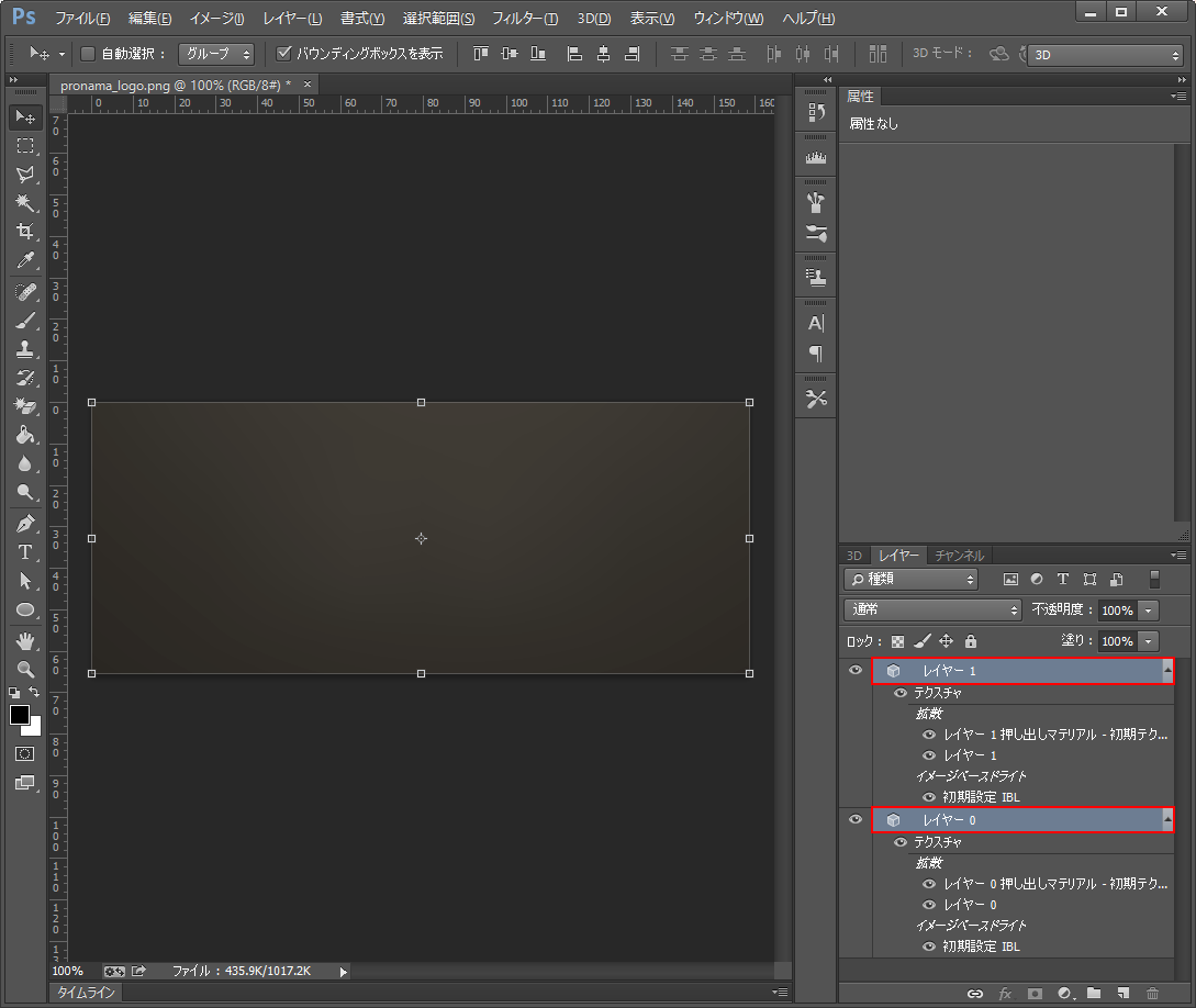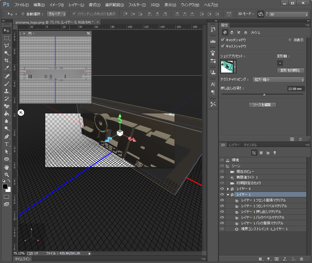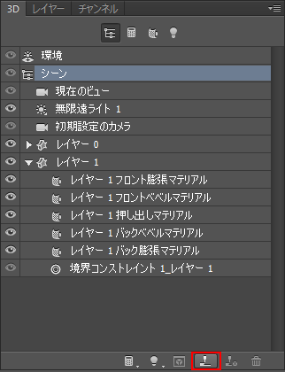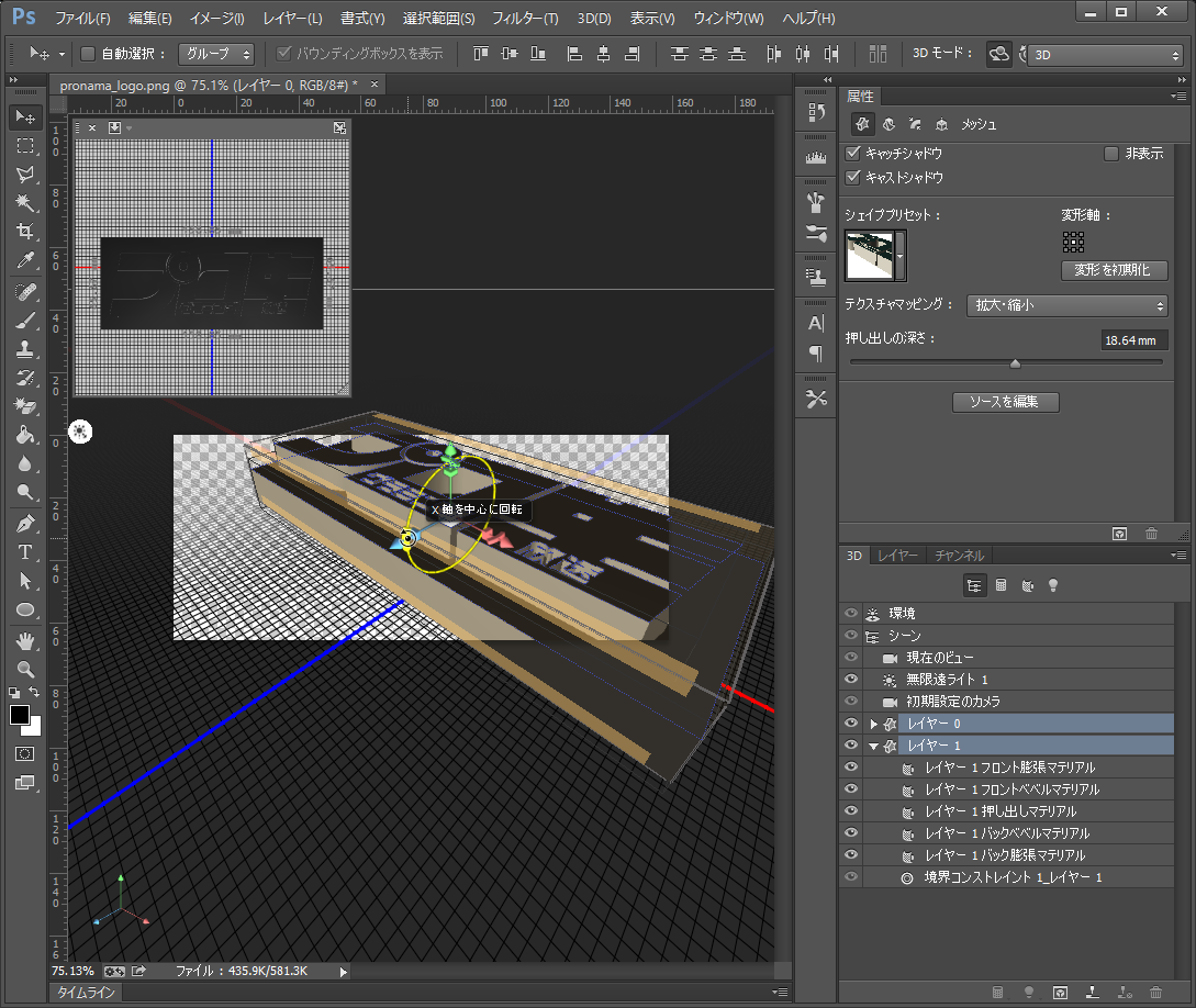 ロゴと土台のレイヤーのふたつを選択し(Ctrl 押しながらクリック)、メニュー [3D]-[3D レイヤーを結合] から 3D レイヤーをまとめます。こうすると 3D ウィンドウから両方の 3D オブジェクトが扱えるようになります。