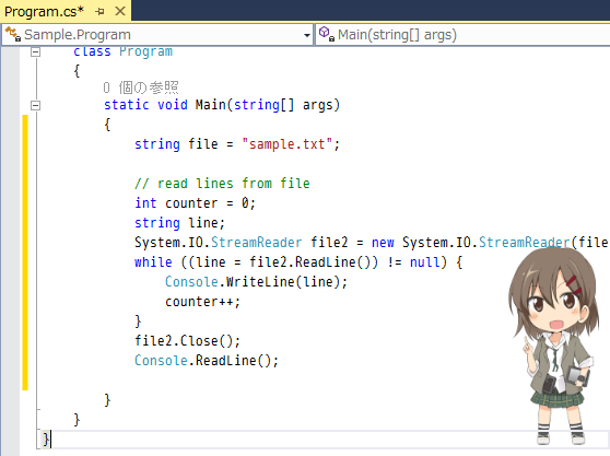 サンプルコードの file の部分、編集中のコードの変数 file が使われています。参照元は Code: Reading a Text File One Line at a Time (Visual C#) なのですが、元のコードでは "c:\test.txt" です。また、変数 file が被るため file2 に変わっています。