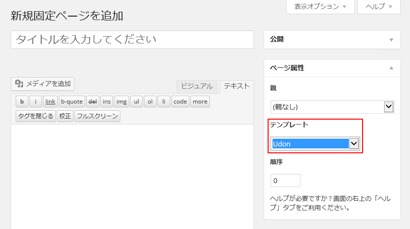 以上で、固定ページの新規作成で作成したテンプレートを選択できます。今回の場合テンプレートにページ内容をすべて書いているので、テキストは空白のままで構いません。