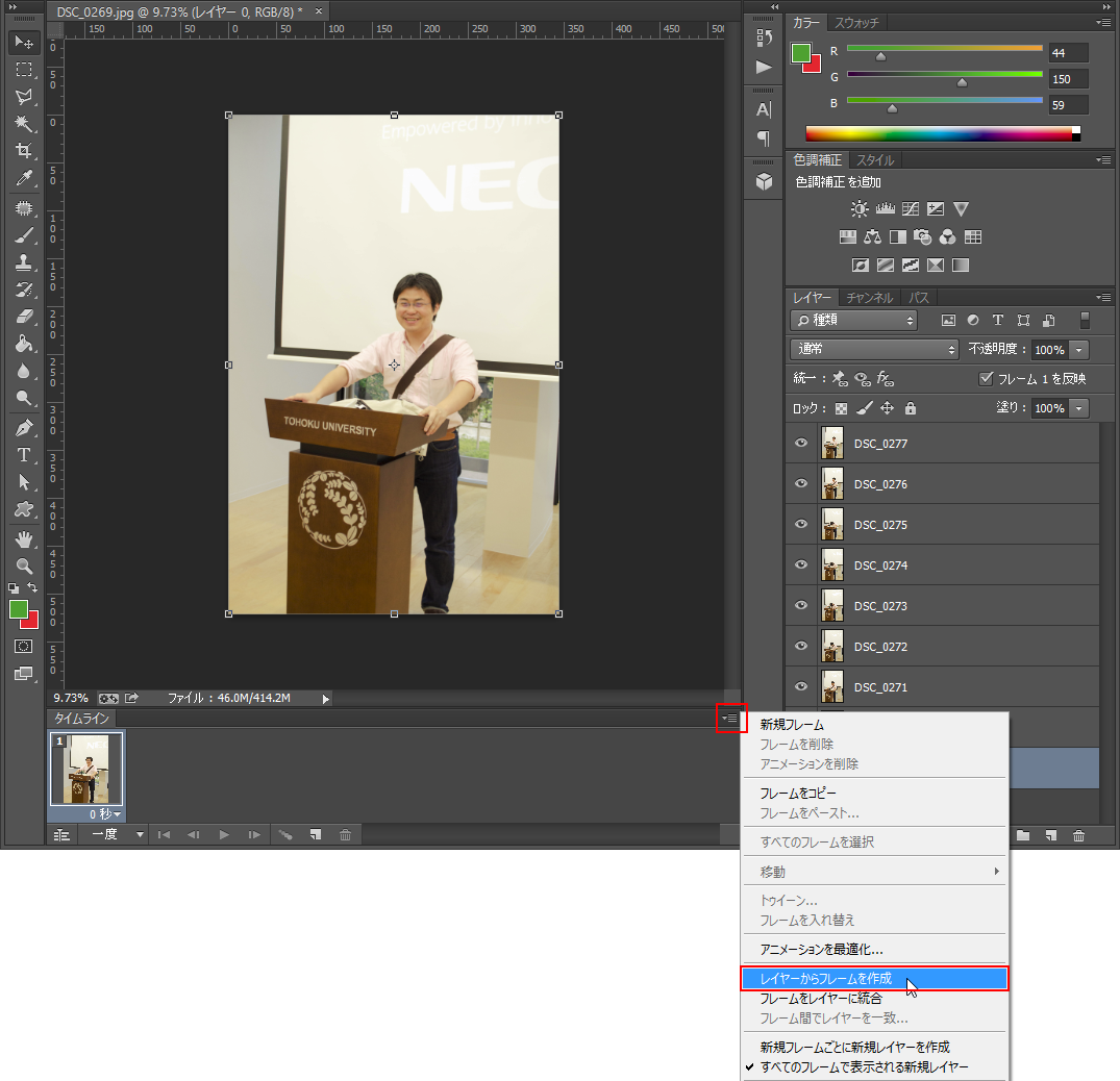 GIF アニメの各フレームとなる画像をレイヤーとして読み込み、タイムラインウィンドウからメニューの「レイヤーからフレームを作成」を選びます。