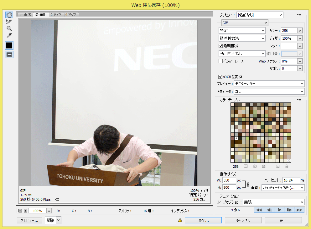 メニュー [ファイル] – [Web 用に保存] から GIF 形式で保存できます。このウィンドウでも、アニメ再生の確認や、繰り返し回数の設定ができます。