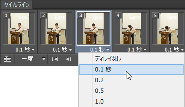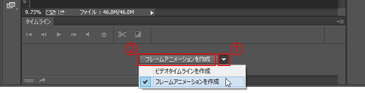 画像を開いている状態で、メニュー [ウィンドウ] から [タイムライン] を表示し、「フレームアニメーションを作成」をクリックします。