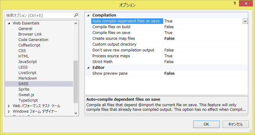 ツール オプションの Web Essentials の項目から、SCSS ファイルの保存時や、ビルド時に CSS ファイルの生成を行う設定があるのでこれを利用します。