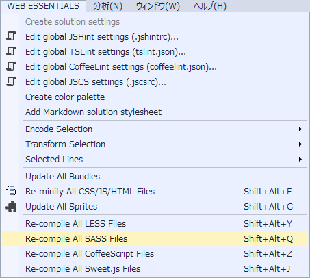 [WEB ESSENTIALS] メニューの [Re-compile All SASS Files] も利用できます。