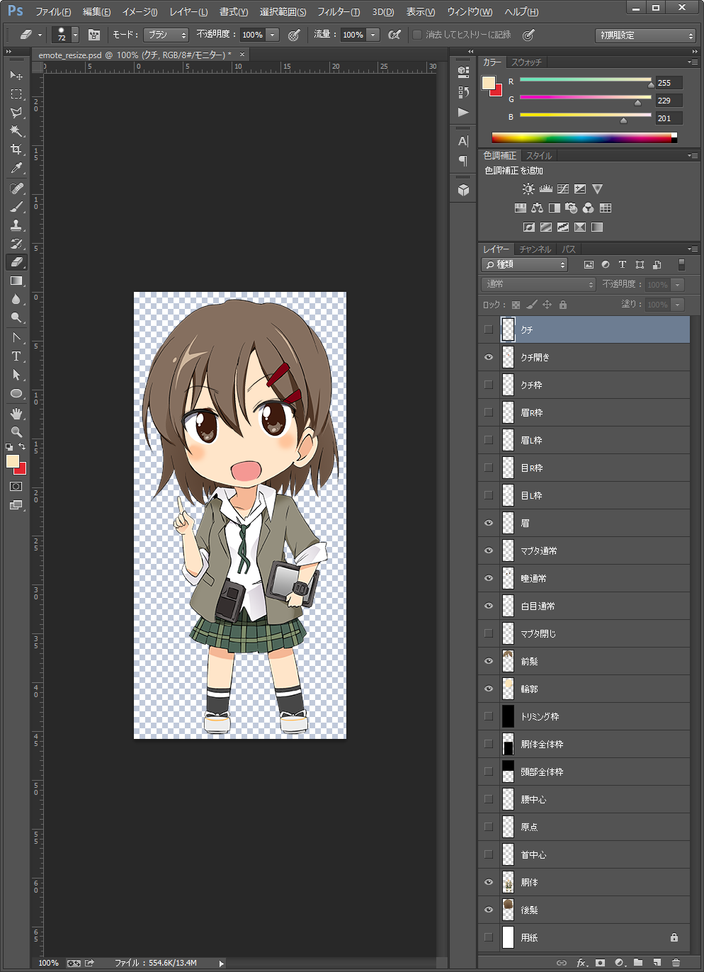 Photoshop のスクリーンショットを貼り忘れていました。また、emotefree_resize.zip をダウンロードするとリサイズ後の使用した psd ファイルを確認できます。