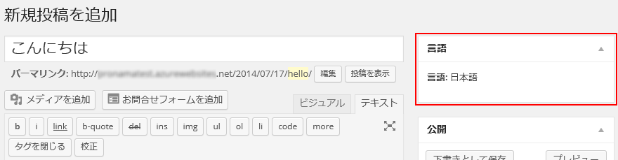 コピーされた内容を編集し英語版を作成します。言語表示部分で日本語の投稿と関連付いていることがわかります。