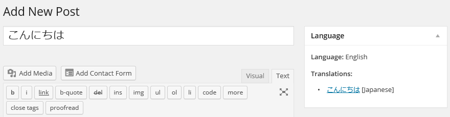Bogo を利用している状態で投稿するとロケール情報が付きます。言語を切り替えて、日本語の投稿の編集画面を見ると、「Add English translation」ボタンが付いていますので、ここから英語版の投稿を作成します。