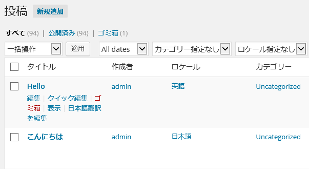 投稿一覧で、ロケールの表示や、対応する別の言語の投稿作成もできます。