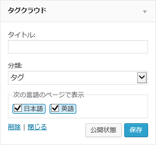 ウィジェット、メニュー、カテゴリー、タグなどの言語ごとに用意する機能はありません。ウィジェットとメニューは、言語によって表示する・しないのオプションが増えるので、英語版・日本語版メニューを用意するなどある程度対応は可能です。
