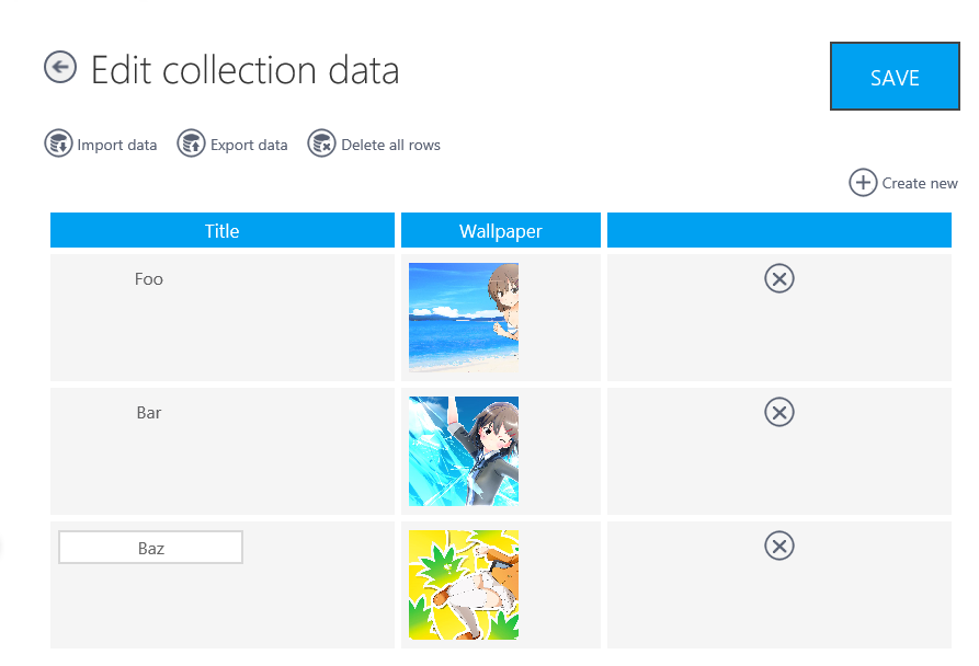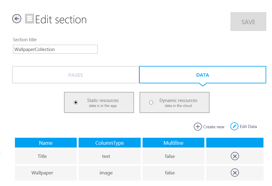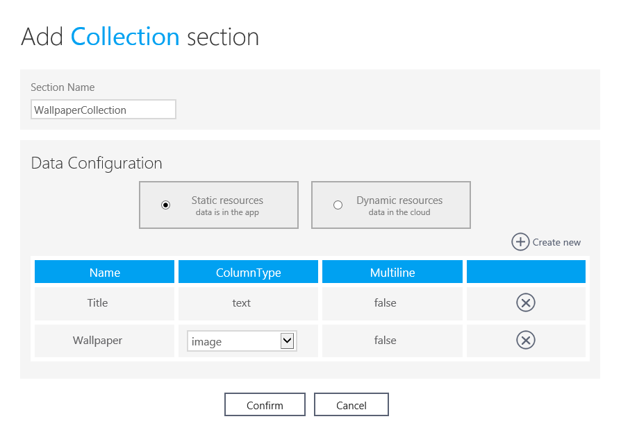 コレクションの追加画面はこんな感じ。Static resources と Dynamic resources が選べて、Static だとアプリの中でデータが変わらないってこと。Dynamic だと App Studio のクラウドサービスにデータが保存されるの。App Studio でデータを変更すれば、アプリにも反映されるってわけ。ここでは、Static で Title と Wallpaper の名前を持つデータのコレクションを定義してみたよ。