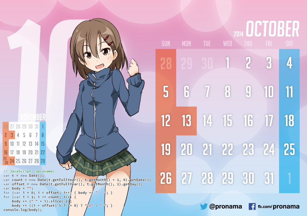 今年も プロ生ちゃんカレンダー の制作を予定しています。カレンダーに月ごとに異なるプログラミング言語でカレンダーを表示するソースコードの掲載を考えています。そこで、カレンダーに掲載するソースコードを募集します!