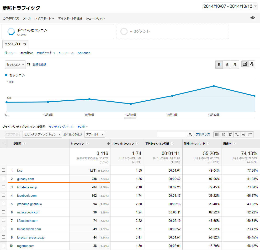 はてブからのセッションも同数程度ですね。はてブの IT カテゴリにホッテントリ入りし、その後 Gunosy にも取り上げられたようです。はてブからの流入と同程度と考えると、妥当なのかな?