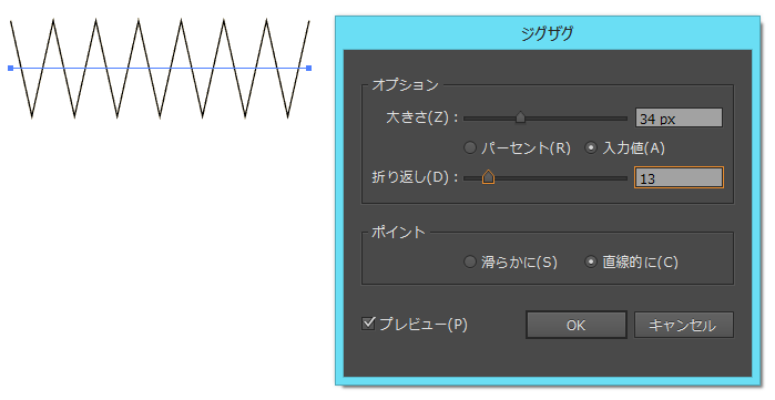 ラインのパスを配置し、選択した状態で、メニュー[効果]-[パスの変形]-[ジグザグ]を選びます。
