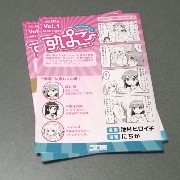 暮井 慧(プロ生ちゃん)と部活「情報処理研究会」のメンバー 戸増千由莉とフィネス・ヒルヴィレッジが活躍する Web コミック「すぱこー」!