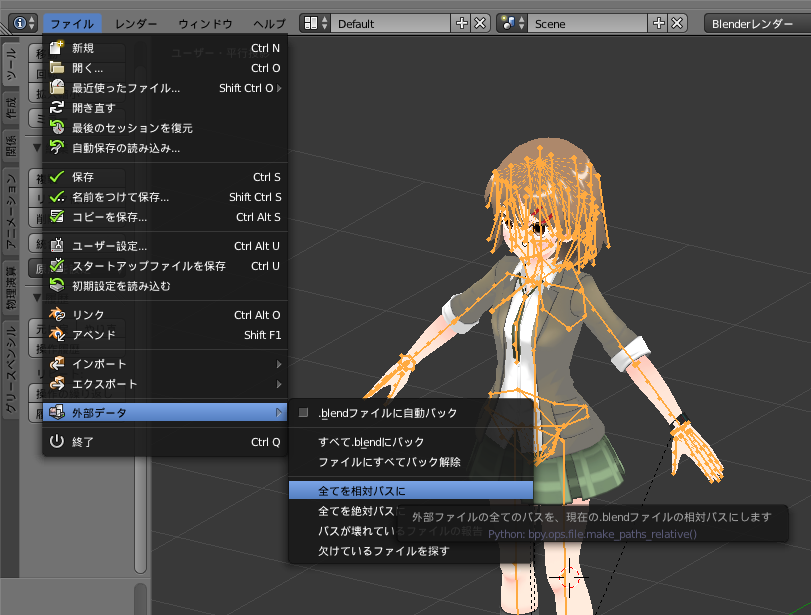 メニュー[ファイル]-[外部データ]-[全てを相対パスに]を実行すると、テクスチャ画像のパスが相対パスで記憶されるから、誰かに Blender ファイルを送るときはこうするといいはず!