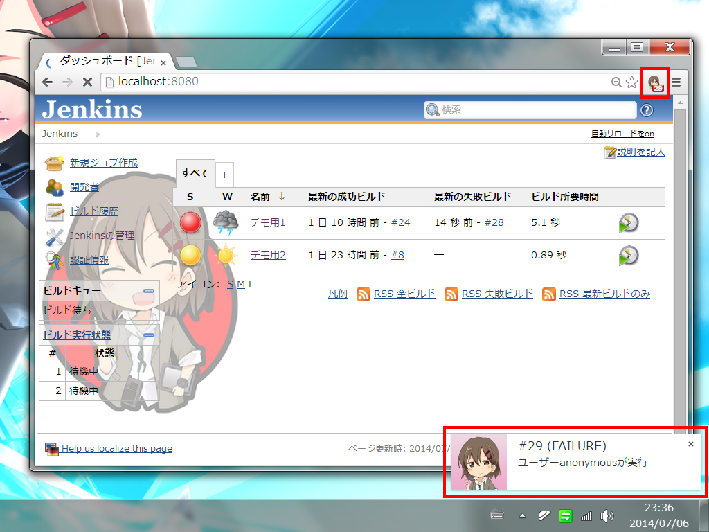 プロ生ちゃん(CV 上坂すみれ)に Jenkins のジョブ結果を通知してもらう方法 より。Jenkins の Simple Theme Plugin を利用して背景を変更しています。