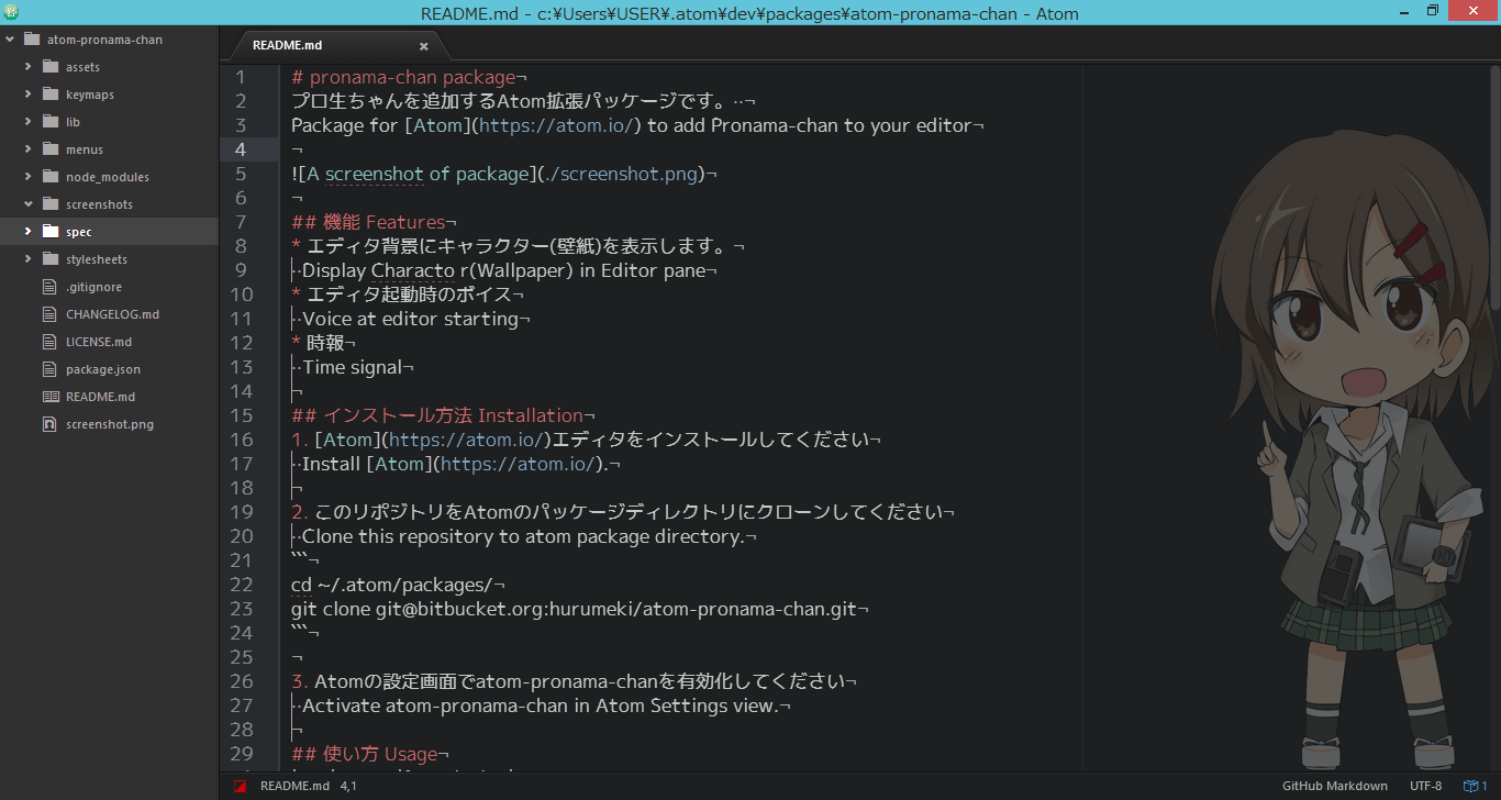 GitHub 製エディタ、Atom の背景にキャラクターを表示するパッケージ。hurumeki/atom-pronama-chan で公開されています。プロ生ちゃんのボイス付き!
