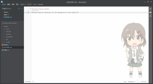 Adobe 製エディタ、Brackets の背景にキャラクターを表示する拡張が、tuyapin/Brackets-Pronama-Editor からダウンロードできます。