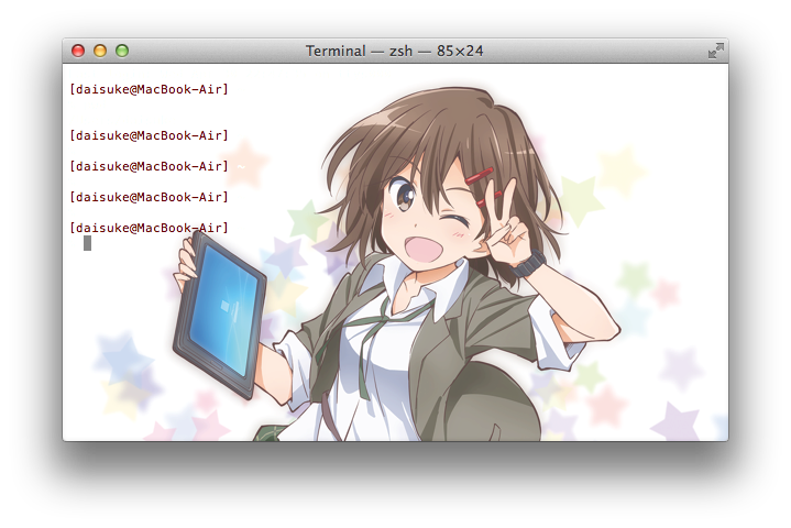 OSX のターミナルの背景をプロ生ちゃんにする – .@daisuke_nomuraの日記 より。Terminal の Preferences メニューの Settings から背景画像を設定できます。