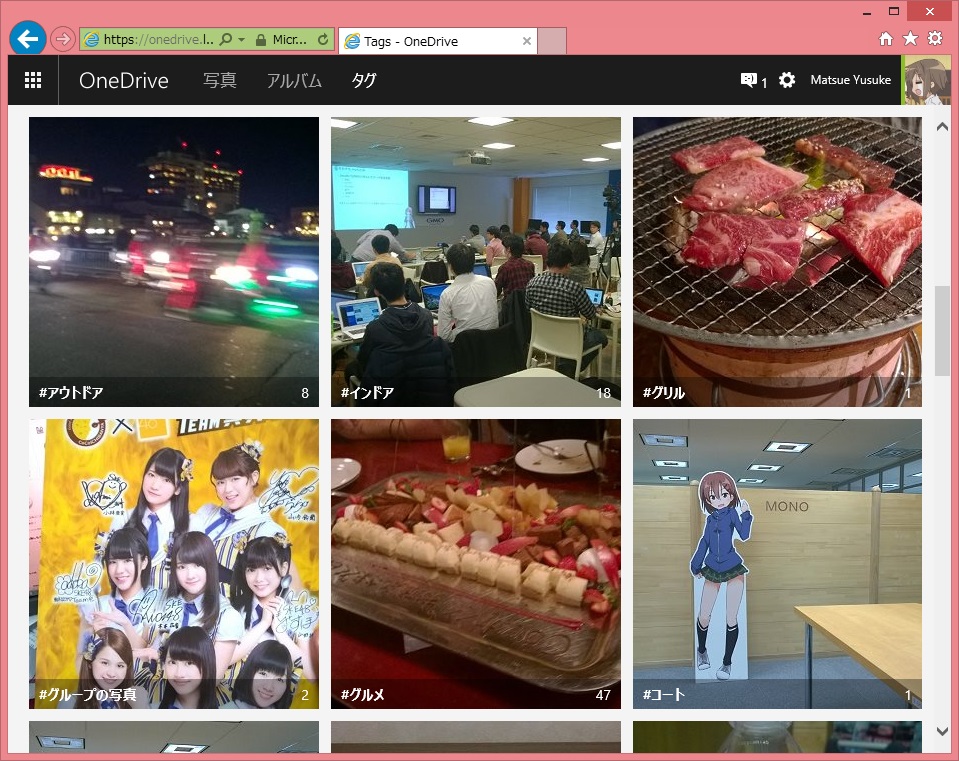 Bing の機能を利用して写真に自動的にタグが付く機能も追加されています。ヘッダーの「タグ」から一覧できます。