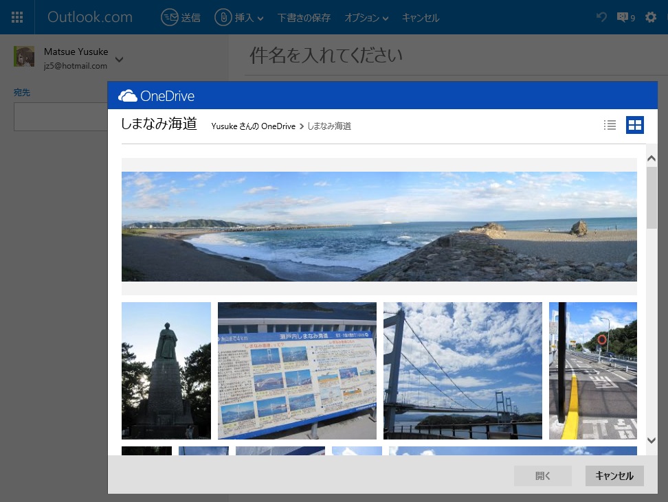 また、OneDrive の写真を Outlook.com で送信することも、以前からできます。挿入メニューから OneDrive の写真を選べます。