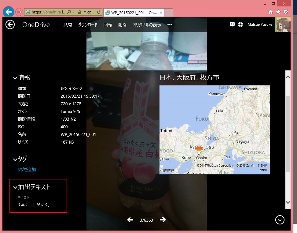 以前から OCR 機能も一応ついています。文字が含まれる写真にはテキスト情報が付加されています。ただし、実用レベルではない印象です。検索でもテキスト情報は使われていないようです。