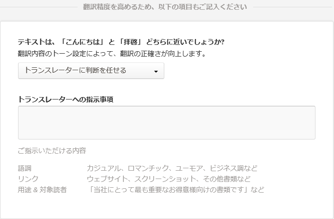 またこのステップで、トランスレーターへの指示を入力できます。語調や用途の説明や、リンクで参考になるものを示せます。
