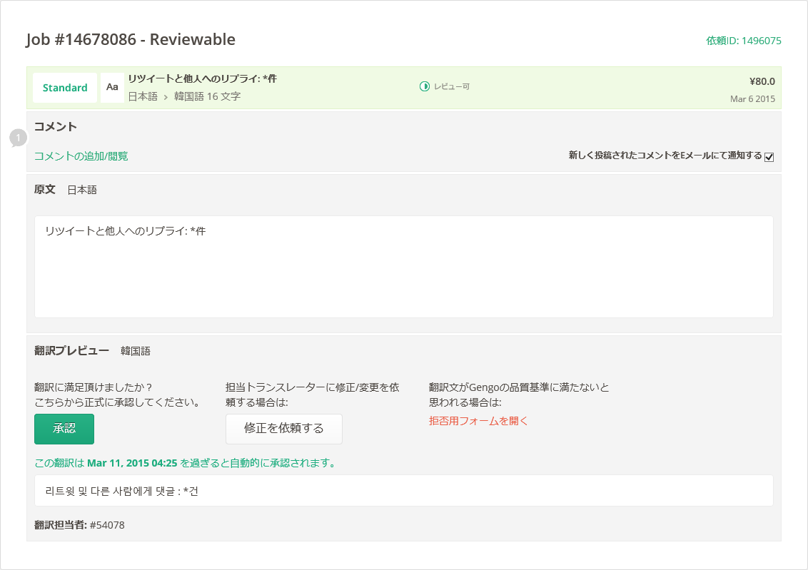 翻訳結果を確認して、承認または修正依頼を行います。承認は時間が経てば、自動承認されるので、放置しておいても構わないです。翻訳者の方から、意味が少し違ったなど修正が来る場合もあります。