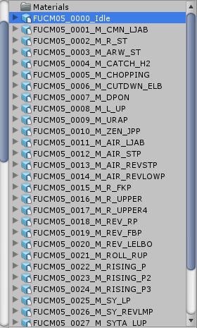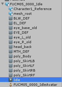 ※ アニメーションデータは、FBX ファイルを展開して三角のアイコン(再生ボタンみたいなアイコン)で表示されているものです。