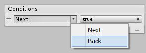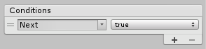 ループ1の矢印をひとつ選択し、Conditions の「+」をクリック。デフォルトで Next/true が追加されるので、ループ1のすべての矢印でこの操作を行います。