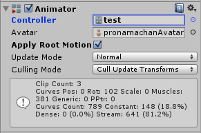 シーン上にプロ生ちゃんを追加し、プロ生ちゃんの Animaor の Controller に先ほど作成した test という Animation Controller をセットします。