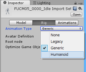 プロ生ちゃんにもアニメーションを適用させるには、各 FBX データの Rig 設定を Humanoid にする必要があります。Unity エディターで「HQ Fighting Animation」の「Animations」フォルダーを開き、FBX ファイルを選ぶと Inspector に情報が表示されるので、Animation Type を「Generic」から「Humanoid」に変更します(FBX は同時に複数選択できるので、まとめて設定を変更すると楽です)。