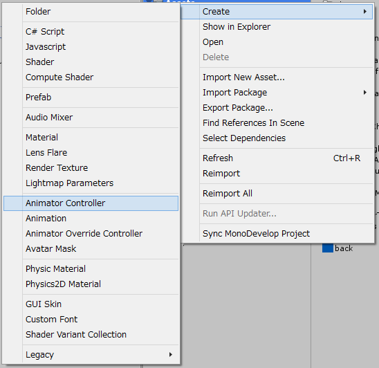 Project ビューの適当な位置で、Create → Animation Controller と選び、Animation Controller を作成します。