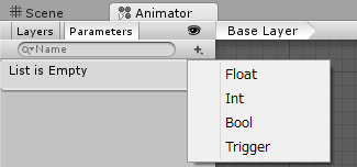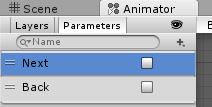 左上の Parameters というタブをクリック。「+」をクリックして Bool のパラメーターをふたつ追加します。