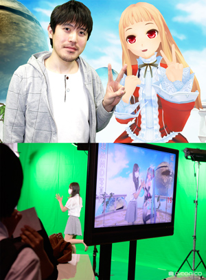 ニコニ立体写真館 は、「最新の VR 技術を用いて niconico でお馴染みの 3D・MMD モデルと記念撮影ができる」ブースです。「モーションキャプチャー装置を装着したスタッフと画面中のキャラクターがリアルタイムに連動し、様々なポーズでキャラクターとの撮影が可能」とのこと。