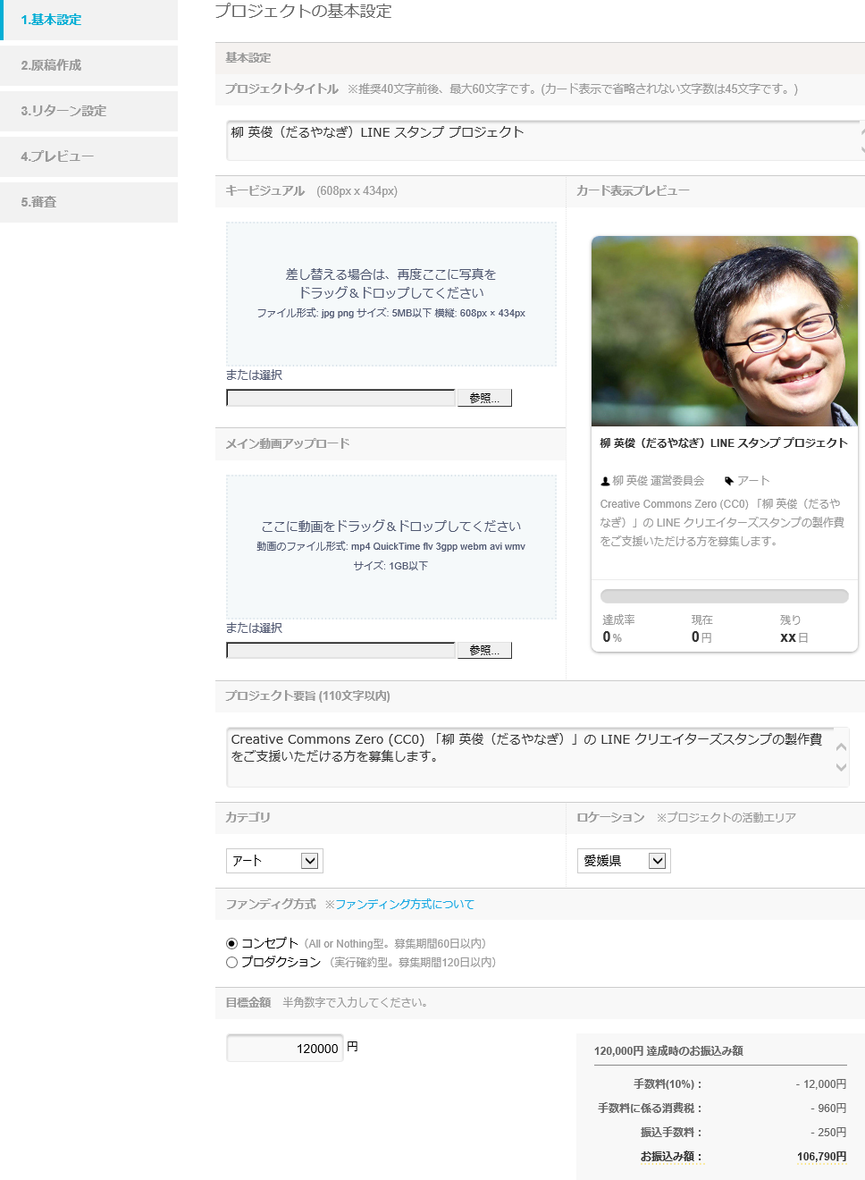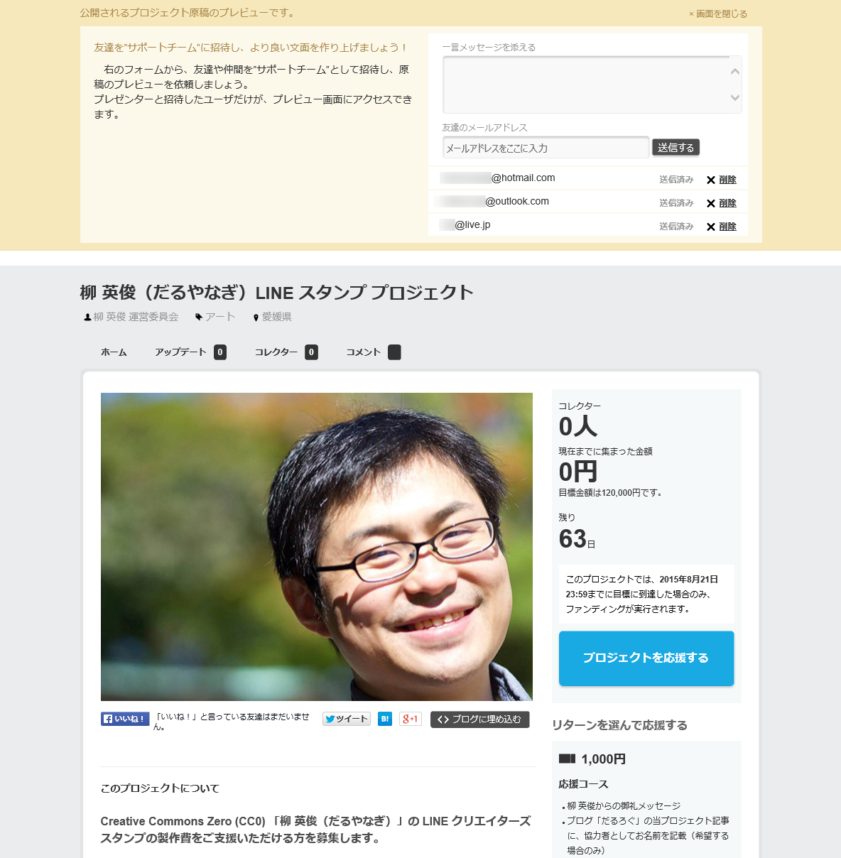 はじめたプロジェクトはこちら、柳 英俊(だるやなぎ)LINE スタンプ プロジェクト。内輪感が強いですが、クラウドファンディング自体、仲間内での盛り上がりが周囲の目を引くことが、プロジェクトを成功へ導くポイントのひとつです。