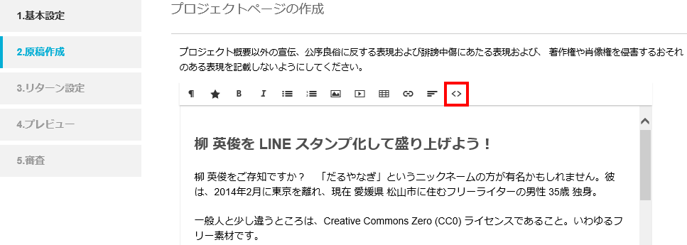 次に、プロジェクトページの本文を作成します。Web ページ上でいろいろ編集を行えますが、HTML を理解している人は、別途 HTML で原稿を用意して、「<>」ボタンから HTML コードを取得・設定する方が簡単な気がします。