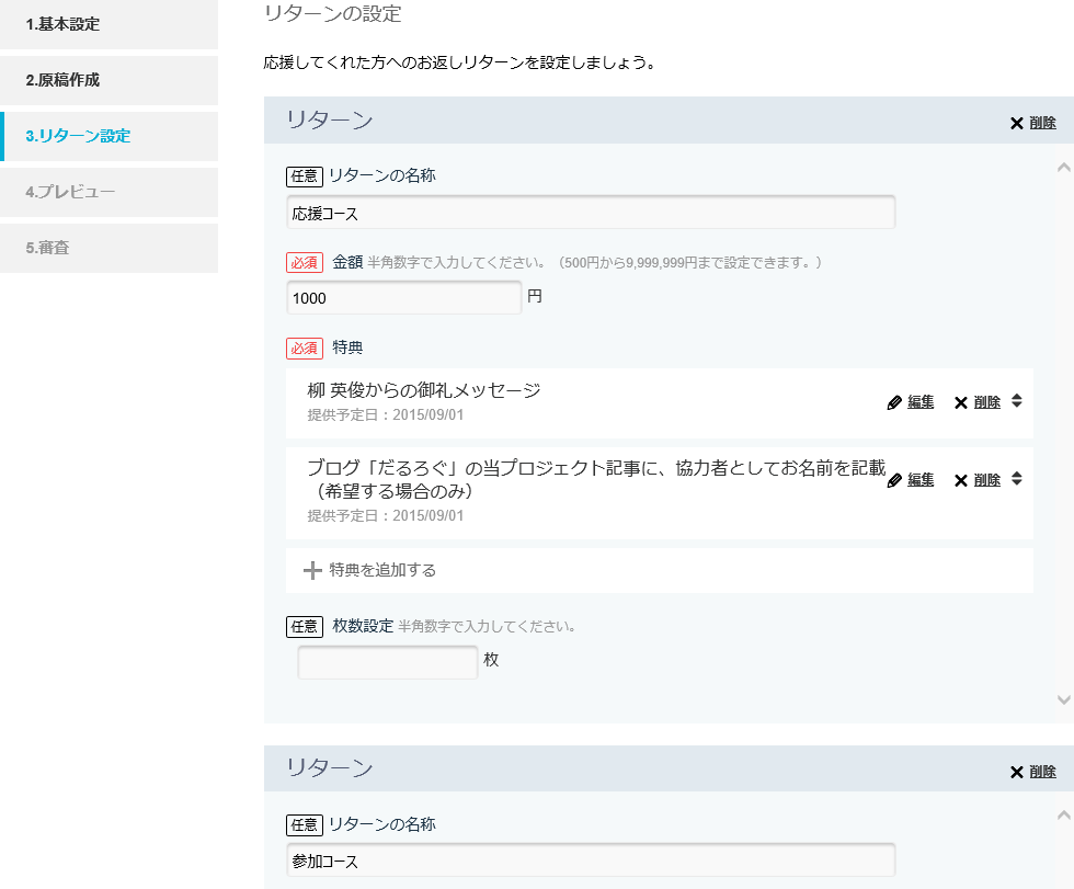 最後に、リターンを設定します。「リターン」は「特典」をまとめるグループで、リターンを追加し、さらにリターンに特典をさらに追加していきます。特典ごとに支援者(コレクター)の住所が必要かも設定できます。