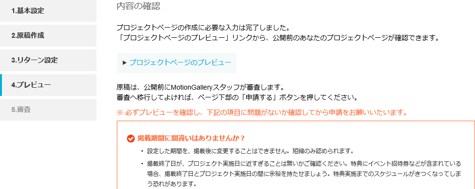 ここから、MotionGallery の Web サイトにプロジェクト用のページが作成され、プレゼンターのアカウントでログインし、情報を登録していきます。「基本設定」「原稿作成」「リターンの設定」は、何度もページを行き来し編集できますが、一度保存しないと次へ進めないようです。