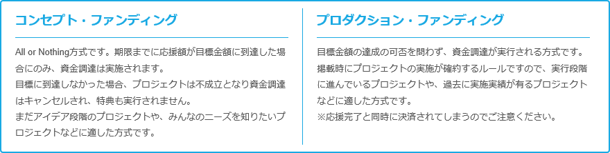 最近は他のプラットフォームでもできるところが多いですが、資金を追加で集めたいといった場合に、応援するとすぐ決済される方法も選べます。MotionGallery では、プロダクション・ファンディング形式と呼んでいます。目標額に達しない場合は、手数料が20%になります。
